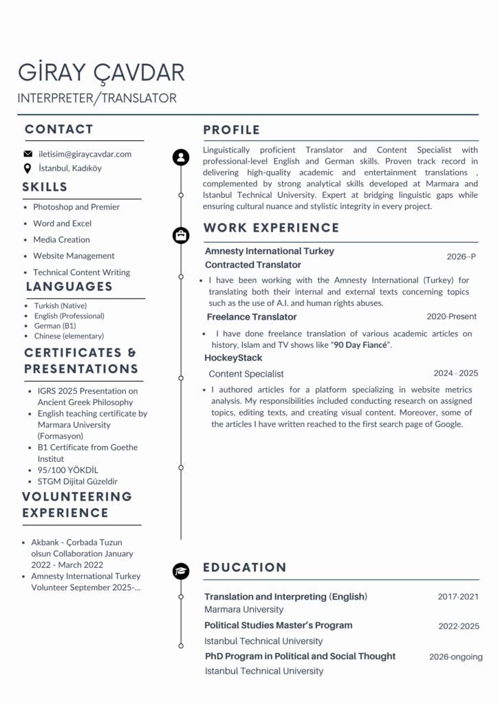 Türkçe, İngilizce ve Almanca dillerindeki yetkinliğim, çeviri projelerine çok boyutlu bir perspektiften yaklaşmamı sağlıyor. Bu dil çeşitliliği, metinlerin sadece kelimelerini değil, ardındaki kültürel ve kavramsal derinliği de doğru aktarmama olanak tanıyarak beni sektördeki diğer aktörlerden ayırıyor.